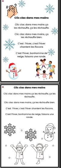 Comptines et chants hiver Comptines et chants hiver 15 janvier 2026 maitressedumardi Commentaires 0 Commentaire Vous trouverez ici mes coups de coeur pour la période d’hiver. J’en ajouterai d’autres… pour chaque chanson il y’a la version à colorier.