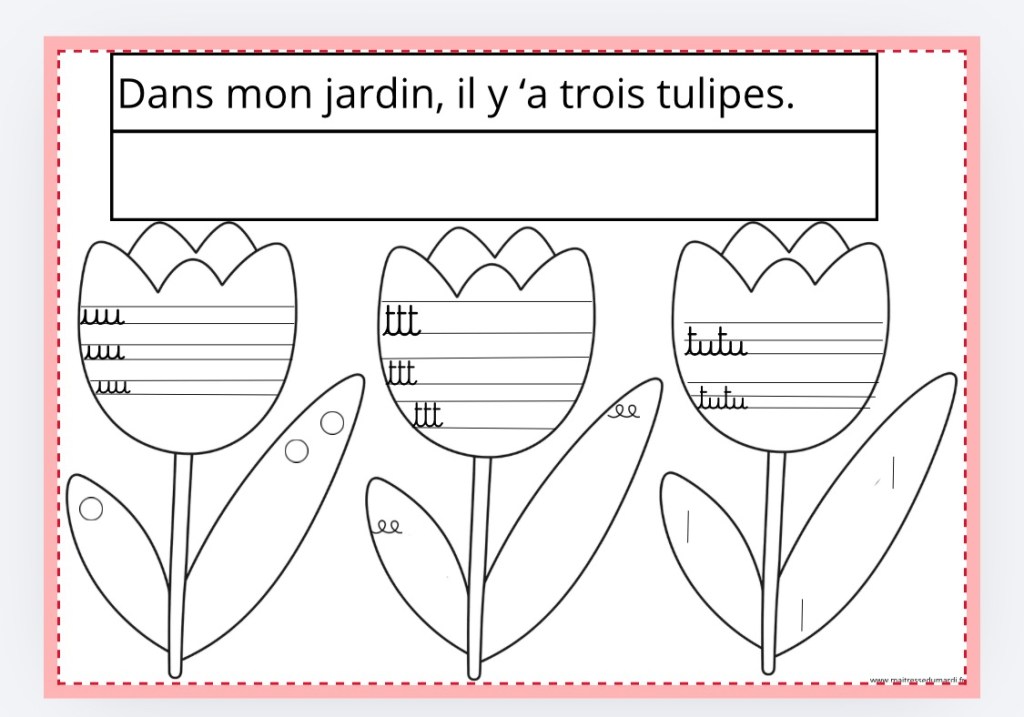 Les tulipes : cet exercice a pour objectif de travailler les lettres i ,u et t : j’insiste pour que mes élèves enchaînent et fassent les barres sur les t en dernier. Je leur explique que apprendre à écrire en lettre cursive c’est avoir un geste continu. ( sauf pour les lettres rondes) .